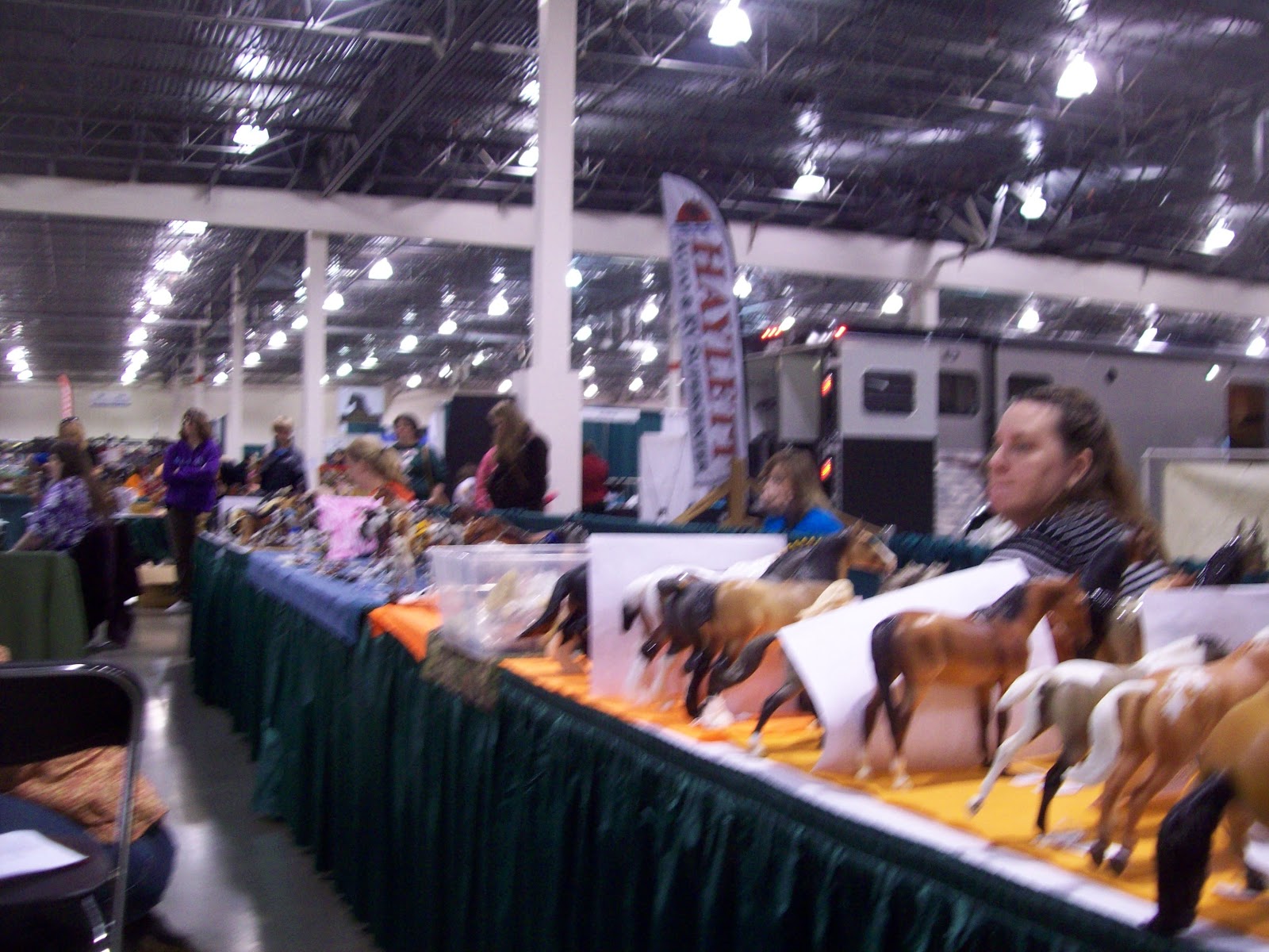 The Mustang Class was next and I got 4th place with Britannia but I forgot to take a picture of her. When I went to go pick her up there was a note that said please see judge. So I took her back to the table and since I hadn't been able to watch the judging from nerves I didn't know who the judge was. Elizabeth (a very helpful Judge next to us) pointed out a lady named Karen and I went to go see her. Karen said she really loved my horse except for a mark on her tail and offered after the show to fix her. I thanked her and went back to the table. I told Jake and Elizabeth what the judge had said and Elizabeth said Karen Zorn is so nice and I my eyes went wide.....KAREN ZORN? THE MODEL HORSE PAINTER? Lol. I was shocked, I love her work and she had been judging the OF Stone table all morning and I didn't even know it!!! I was totally geeked that she offered to touch up my horse and that she had been awarding me ribbons. It turns out she lives in Ann Arbor which is just a short drive from where I live. So later when I have time and we can get together I can hopefully have her touched up. Masquerade was called back up for Section Champion round and went on to win Reserve in Stock Class!
